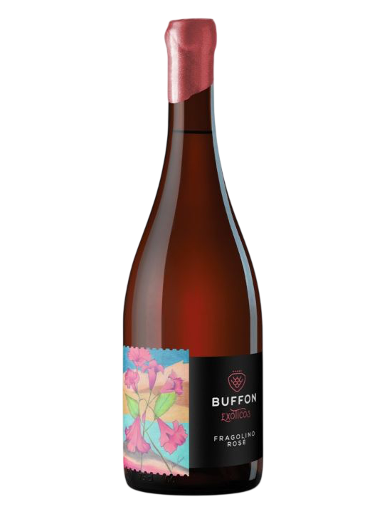 O Vinho Buffon Exótico Fragolino tem aspecto limpo e brilhante, coloração blush.