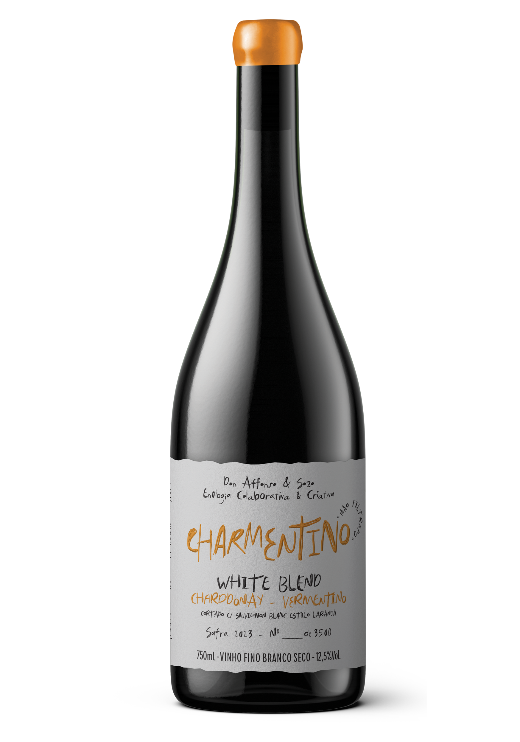 O Vinho Sozo Charmentino White Blend apresenta uma coloração amarelo pálido, com reflexos dourados.