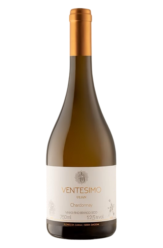 O Vinho Ulian Ventesimo Chardonnay apresenta uma cor amarelo ouro brilhante.