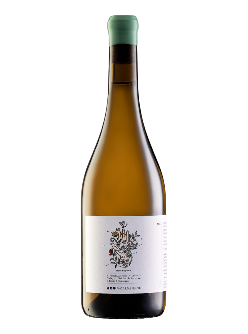 O Vinho Finca Mas Perdut Branco exibe uma cor amarelo-palha com reflexos esverdeados. Seu aspecto é brilhante e de alta clareza, refletindo sua frescura e juventude.